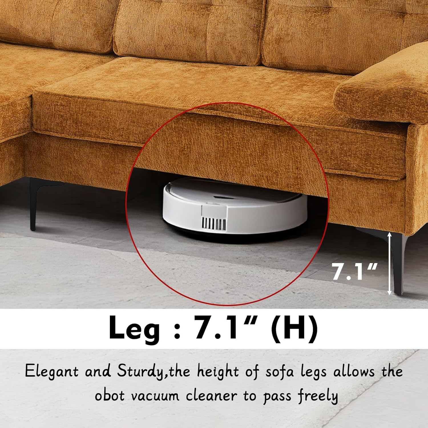 - Solid Frame & 7.1 "Sofa legs: The built-in frame of the sectional sofa couch is made of solid wood and metal structure, durable, with a maximum load-bearing capacity of 1000LBS. Whether you are sitting or lying down, children or animals jumping on it, there is no need to worry about the stability of the sectional sofa couch. 7.1-inch sofa legs allow the sweeping robot to easily enter, easy to clean, not easy to hide dirt, and easy to keep clean and tidy